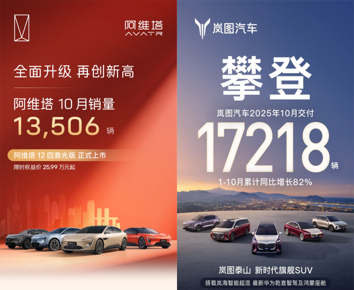 东风奕派科技10月销量31107辆,同比增长34.9%。长安旗下的深蓝汽车10月销量达到36792辆,环比增长9.42%。岚图和阿维塔10月分别交付了17218辆和13506辆,两家的环比增幅都在10%以上,势头向好。