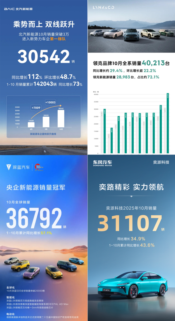 极氪在合并之后,单月销量首次突破6万辆,其中领克品牌拿下了超4万辆的成绩。一直是“扶不上墙”的北汽新能源,极狐和享界两大品牌都走出了一波向上的行情,10月总共交付了30542辆,已经实现了连续三个月同比增长。